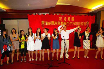 在中国传统节日—中秋节即将来临之际,为丰富海峡两岸留菲学生的业余生活,加强两岸留菲学生的情感交流,中国驻菲使馆于2010年9月19日组织了一场“花好月圆-海峡两岸留菲学生中秋联欢晚会”,约120余名两岸留菲学生欢聚一堂,在马尼拉共度中秋佳节。驻菲律宾大使刘建超出席联欢晚会并与同学们促膝交谈。