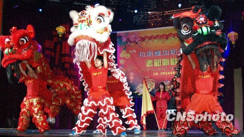 资料图: 当地时间2010年2月28日元宵节,巳有11年历史的美国拉斯韦加斯华人协会举办“拉斯韦加斯华人春节联欢会”,500多位华人华侨和美国朋友观看了拉斯韦加斯华人和美中文化协会联合演出的歌舞、小品、杂技等节目,共庆元宵,中国驻旧金山总领事馆教育参赞邵巍参加了联欢会。图为瑞狮献舞迎新年。 中新社发 卢威 摄