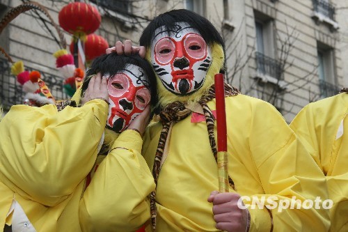 资料图: 法国巴黎著名的“唐人街”——十三区2010年2月21日下午举行虎年春节华人嘉年华大游行,给这个有着显著中国传统文化特色的华人聚居区带来了欢乐与喜气。图为游行队伍中的孙悟空造型。 中新社发 吴卫中 摄