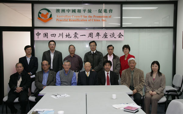 悉尼5月12日电 (文/胡萌、摄/姜长庚)在澳洲和平统一促进会的组织下,近二十个华人侨团组织的代表于5月12日中午,在悉尼举行了纪念512汶川大地震座谈会。与会者在澳洲统促会秘书长、全澳各民族同胞联谊会会长邵群的主持下,为遇难的同胞默哀一分钟以示悼念。