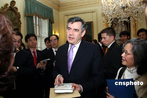 当地时间1月14日下午,即将访华的英国首相布朗在唐宁街十号会见旅英华人华侨、中资机构负责人、留学生等华人杰出代表。图为手拿华人作家赠书的布朗在和旅英华人交谈。 中新社发 李鹏 摄