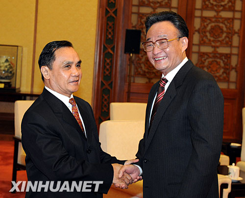 吴邦国在会见时说,中老两国有着传统友谊,双方政治上相互信任、相互支持,发展睦邻友好与全面合作符合两国人民的根本利益。他指出,良好的政治关系应当推动经贸领域的务实合作。中方愿与老方一道,深化在基础设施、农业等领域的互利合作,扩大企业合作,加强人员交流与培训,为两国人民造福。他表示,中国全国人大将同老挝国会保持高层互访,继续开展专门委员会间的友好交往,进行治国理政经验交流,密切在国际和地区议会组织中的配合,为推动两国关系全面深入发展注入新活力。
