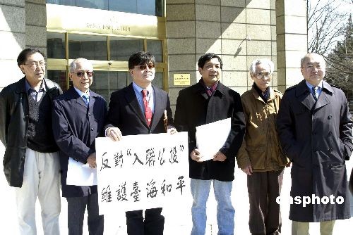 3月13日,大华盛顿侨领张文健、吴惠秋、沈己尧等代表大华府地区120多家华人社团组织,来到位于华盛顿的台北驻美经济文化代表处楼前,抗议台湾当局入联公投,据介绍,华人社团将联合在当地报纸上刊登反“入联公投”的大幅广告。图为侨领们在台北驻美代表处大楼前打出反“公投”标语。 中新社发 邱江波 摄
