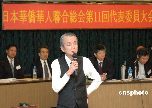 4月23日下午,日本华侨华人联合总会在热海市池田宾馆召开第十一届代表委员大会。近50位来自日本全国各地华侨总会的负责人一致通过由去年7月中途接任会长工作的东京华侨总会会长符易亨继续担任新一届联合总会会长一职。图为符易亨会长发表就职讲话。 中新社发 关妍 摄