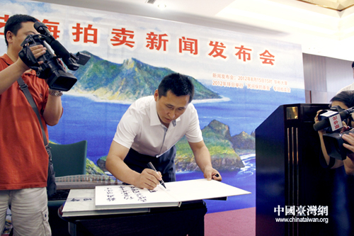 海峡两岸行业汇接促进联盟秘书长梅田在收纳了保钓珍贵历史图片的《中国钓鱼岛》画册上题字。(中国台湾网 普燕 摄)