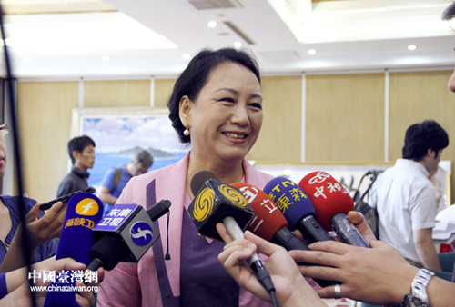 由两岸青年演员混搭组成的光彩艺术团捐赠了其专场演出权,图为该团的副团长朱璨晖女士接受记者采访。(中国台湾网 普燕 摄)