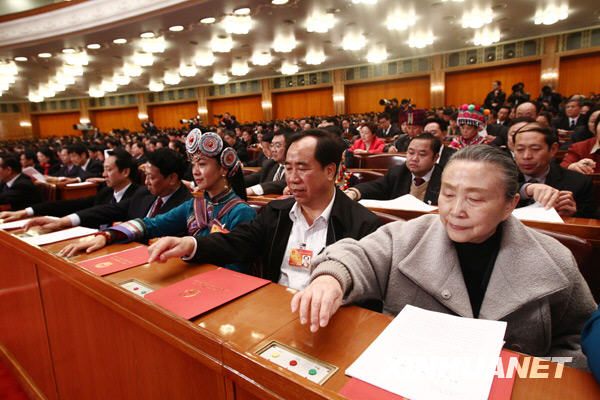 2010年3月14日,第十一届全国人民代表大会第三次会议在北京人民大会堂举行闭幕会。这是全国人大代表在按表决器。新华社记者 刘卫兵 摄