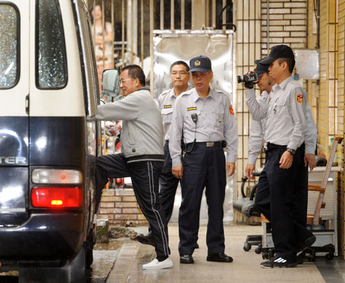 陈水扁(左)遭控利用金控并购向企业索贿及扁家洗钱案,高院13日二审宣判,扁从一审无罪,被改以贪污罪判刑18年,他在宣判后再度踏上囚车返回监狱。图片来源:“中央社”