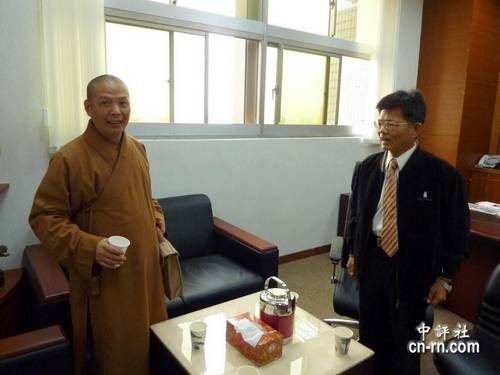昨天适逢佛陀成道日,高雄佛光山都监院院长慧传法师专程送热腾腾的腊八粥到杨秋兴办公室。(中评社 张启芳摄)