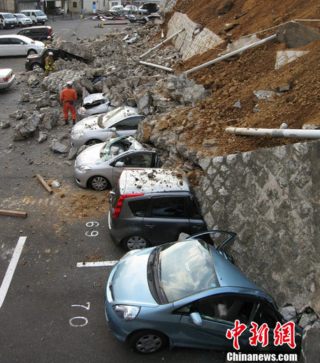 日本近海3月11日发生了强烈地震,首都东京震感强烈。日本气象厅随即发布了海啸警报,称地震将引发约6米高海啸。图为茨城县某停车场的车辆被倒塌的墙壁压毁。