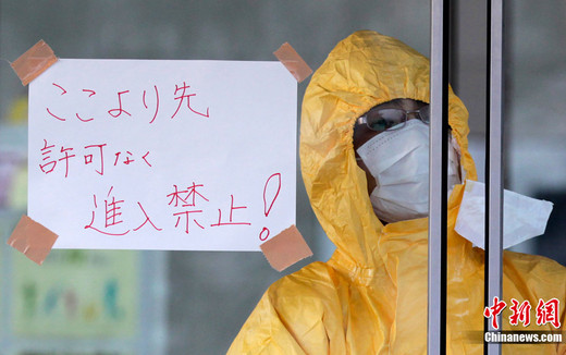日本首相菅直人周一(14日)表示,在大地震和海啸中受损的核电站仍然处于“警戒”状态。东京电力公司周一向政府报告说,福岛第一核电站辐射程度再次超过法定剂量。福岛县第一核电站在地震发生后已经关闭,但是因反应堆冷却系统发生故障导致辐射超标。图为在福岛县二本松,民众隔离接受辐射检测。