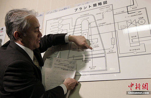 日本政府表示,当地时间15日晨6时10分左右,福岛第一核电站2号反应堆附近传来爆炸声。早些时候的报道指出,福岛第一核电站2号反应堆容器出现部分破损,这表明可能导致更为严重的核泄漏。图为日本东京核电官员用结构图讲解福岛第一核电站2号机组爆炸情况。