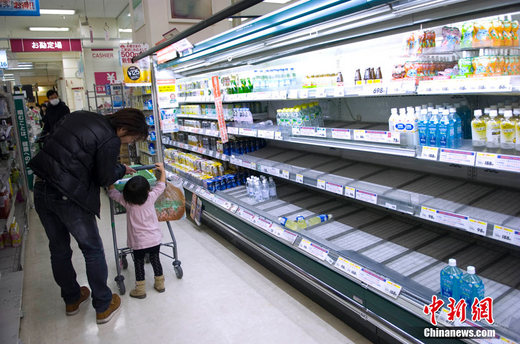 24日,由于东京部分自来水中检测出的放射性碘超过婴儿摄取上限,东京各大超市的饮用水瞬间被抢购一空。图为东京港区某大型超市空空如也的饮用水柜台。中新社发 孙冉 摄