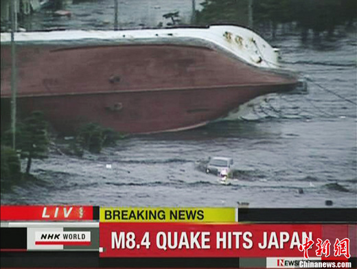 日本近海3月11日发生了强烈地震,首都东京震感强烈。日本气象厅随即发布了海啸警报,称地震将引发约6米高海啸。图为NHK电视台截图显示青森县八户市港口的货船被海啸掀翻。