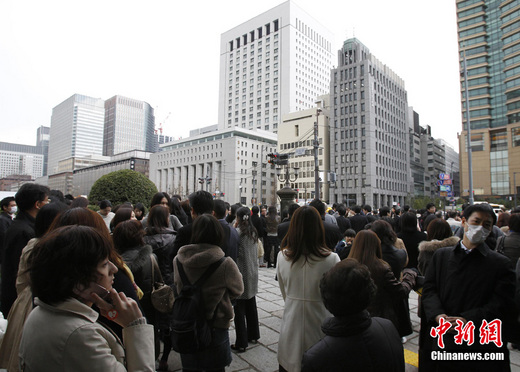 日本近海3月11日发生了强烈地震,首都东京震感强烈。日本气象厅随即发布了海啸警报,称地震将引发约6米高海啸。图为东京金融区公司职员户外聚集避难。