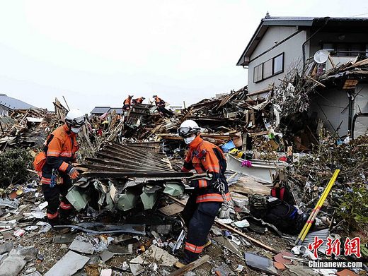 3月16日上午,日本救援队伍在日本岩手县大船渡市的“3.11日本东北大地震”引发的大海啸袭击后的灾区进行搜救工作。中新社发 侯宇 摄