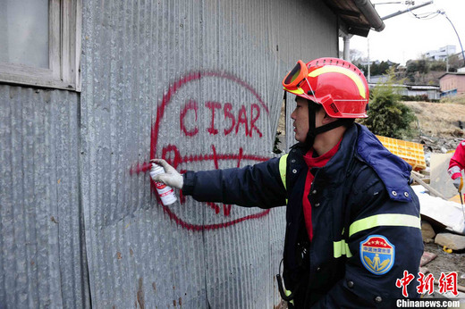 3月15日下午,中国国际救援队队员在岩手县大船渡市受大海啸袭击后的灾区实施搜救。在确认一幢房屋中已经没有生命迹象之后,一名队员在墙壁上喷涂标识。大船渡市紧邻海港,是此次日本东北大地震中受灾最严重的地区之一。中新社发 侯宇 摄