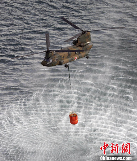 日本防卫省17日表示,陆上自卫队的两架直升机已开始向福岛第一核电站三号机组注水。据NHK电视台报道,当地时间17日上午11时01分左右,自卫队两架直升机开始对第一核电站三号机组开始注水作业。这样的注水作业据信已进行了至少四次。图为陆上自卫队的直升机飞往核电站。