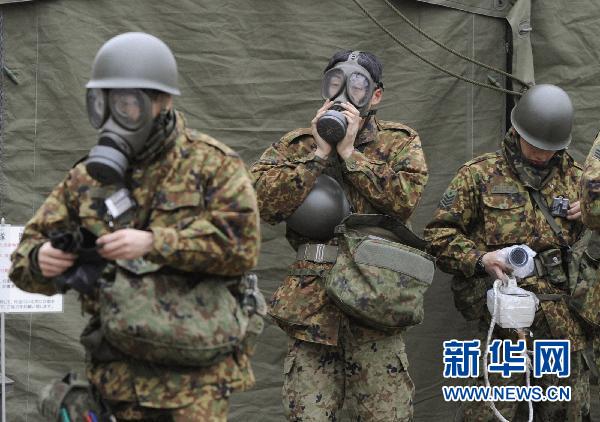 3月15日,在日本福岛县,日本自卫队成员在对核电站事故辐射影响的部分地区进行清洗前戴防毒面具。 新华社/路透