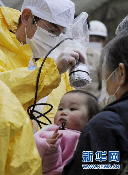 3月15日,在日本福岛县,工作人员对一名儿童进行核辐射测试。 新华社/路透