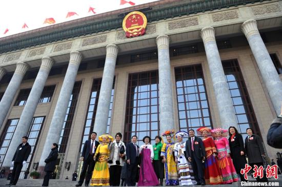 3月9日下午,十一届全国人大五次会议第三次全体会议在北京人民大会堂开幕,图为大会开幕前少数民族代表步入会场。中新网记者金硕摄
