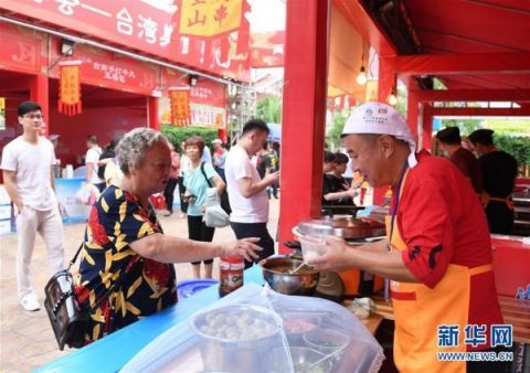 6月14日,厦门市民在两岸特色庙会上品尝台湾美食。 当日,第十一届海峡论坛·两岸特色庙会在厦门举行。 新华社记者 林善传 摄