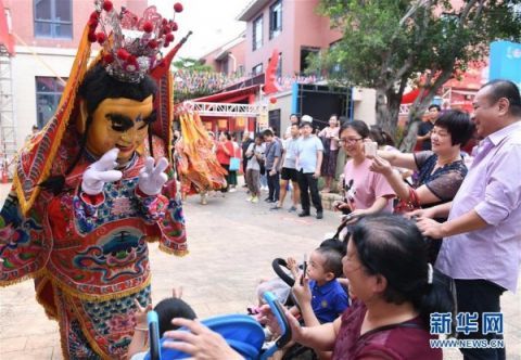 6月14日,台湾“电音三太子”在两岸特色庙会上与观众互动。 当日,第十一届海峡论坛·两岸特色庙会在厦门举行。 新华社记者 林善传 摄