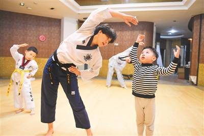在闽台家园台湾青年创新创业基地跆拳道馆,台湾青年创业者陈燕亭(前左)带孩子们热身。新华社记者 宋为伟 摄