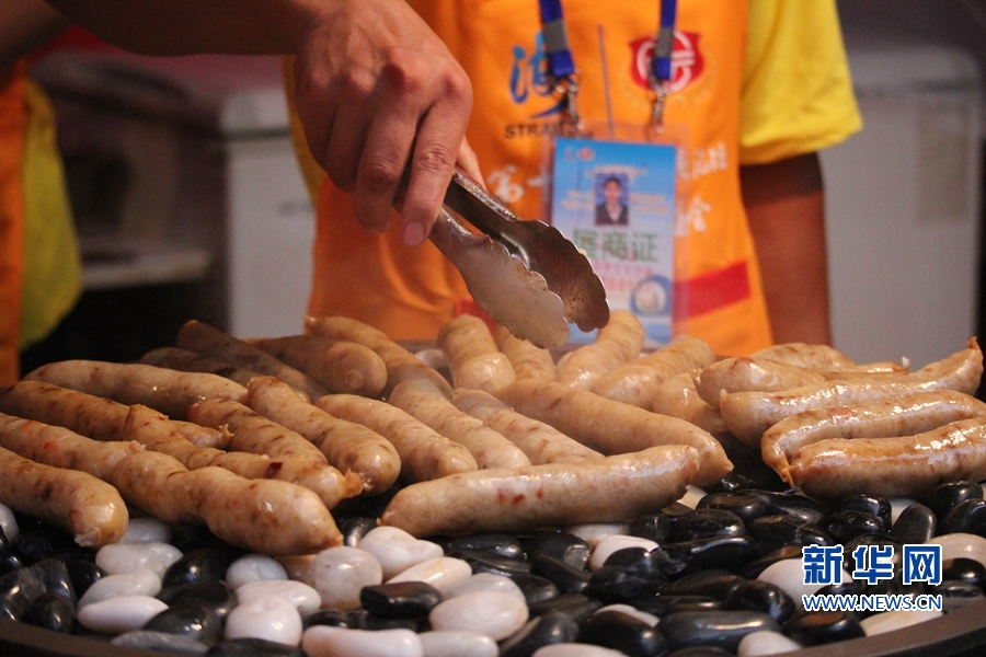 两岸各大夜市的招牌美食集聚特色庙会,图为鹅卵石上的香肠,香气四溢。新华网 刘默涵 摄