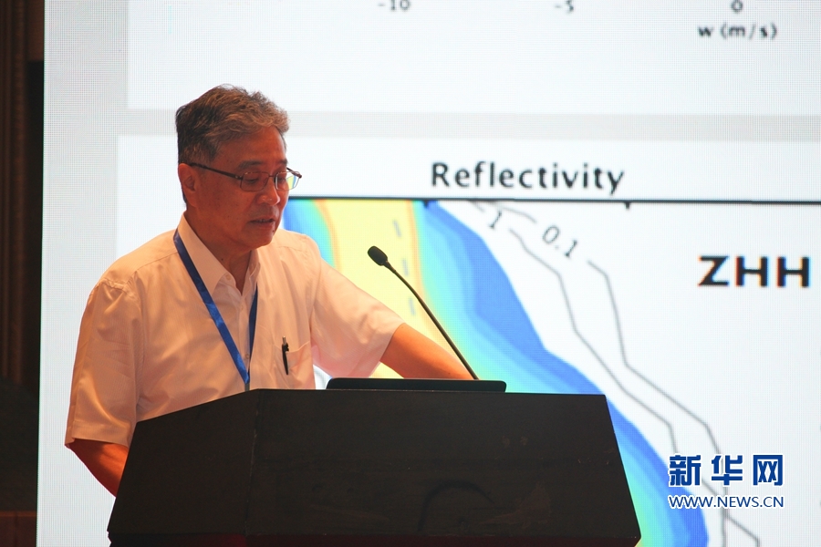 台湾大学大气科学系教授周仲岛现场作“登陆台风的双偏振雷达观测”主题演讲。新华网 刘默涵 摄