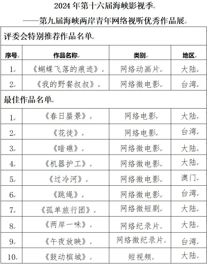 第九届海峡两岸青年网络视听优秀作品以“携手向未来”为主题,面向两岸青年从业创作者征集到网络电影、网络微电影、网络纪录片(含网络微纪录片)、网络动画片、短视频、网络微短剧六个单元共1842部作品,征集数量创历届新高,其中台湾地区138部,香港、澳门等地区华人华裔创作者及留学生投稿36部。经评委会评选推荐,确定10部最佳作品和2部评委会特别推荐作品,获表彰作品将于7月在两岸高校、新媒体平台进行展播。本届优秀作品传达了两岸青年对青春奋斗、创新创业、生活审美的思考和感悟,构建了向上向善的共同记忆。