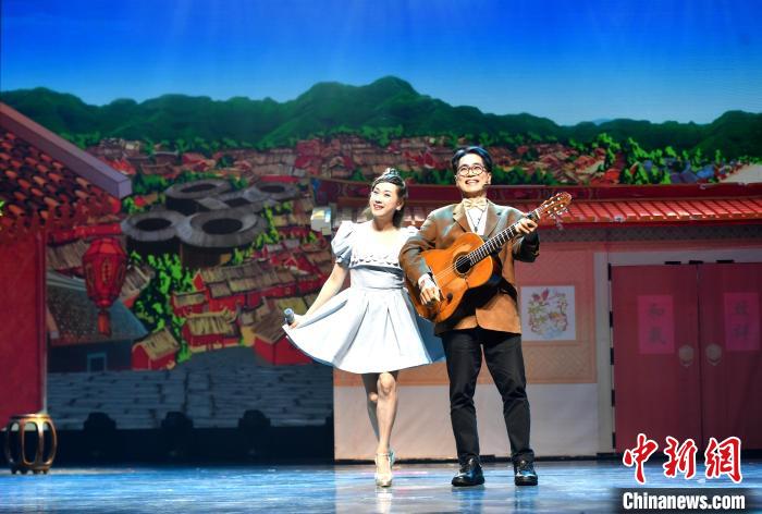 6月15日,海峡两岸艺术交流活动在厦门启动,“艺”心同行文艺演出同时举行。本次活动包括海峡两岸艺术交流节开幕文艺惠民演出、闽台大学生魔术交流大会、海峡两岸青少年街舞展演等内容。图为大陆歌手郑莉莉(左)与台湾歌手叶东安合唱歌曲《外婆的澎湖湾》。中新社记者 吕明 摄