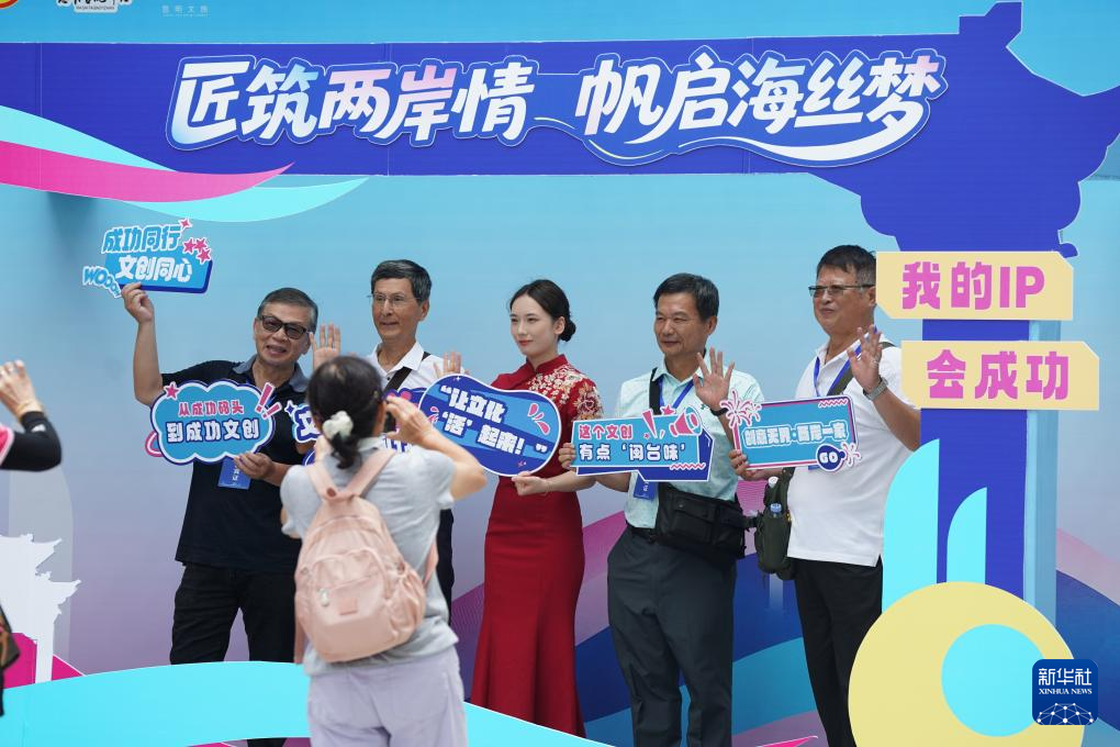 6月15日,参会人员在“匠筑两岸情 帆启海丝梦”的展板前合影。新华社发(王鑫摄)