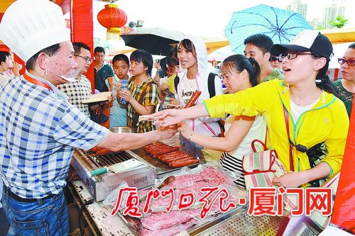 两岸特色庙会人气爆棚,大家争相购买台湾特色火腿肠。