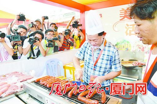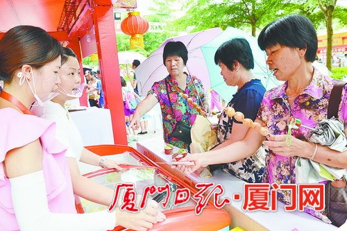 昨天上午10时许,海沧市民文化广场上,来自两岸的特色美食香味四溢,红、黄两色帐篷下,到处人头攒动,热闹非凡。众多市民游客闻讯而来,竞相品尝来自台湾的地道美食。据介绍,本届庙会共设摊位210个,其中170家来自台湾,覆盖台湾21个县市,规模之大超越往届。