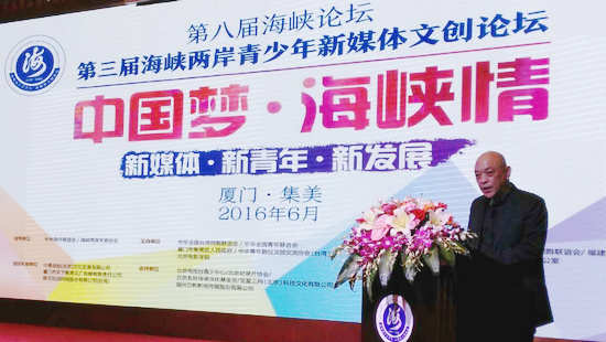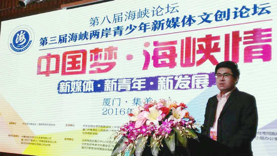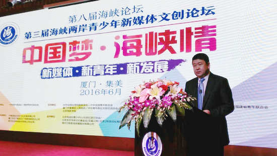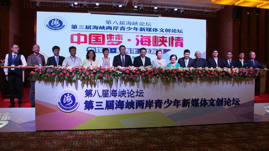 第三届海峡两岸青少年新媒体文创论坛于6月12日下午在厦门集美区京闽北海湾酒店拉开帷幕。该论坛是第八届海峡论坛的重要项目,由中华海外联谊会、海峡两岸关系协会指导,由中华全国台湾同胞联谊会、中华全国青年联合会、厦门市集美区人民政府、台湾中华青年数位文创交流协会、北京电影学院主办,台声杂志社、中国青年网、福建省台联、福建省青联、厦门市集美区文化改革发展工作领导小组办公室承办,由中青创投(北京)文化发展有限公司、厦门市天下集美文广传媒有限责任公司、台湾银河互动网络股份有限公司组织实施,由北京电视台青少中心、北京纪录片协会、北京友好传承文化基金会、亚星三网(北京)科技文化有限公司、福州万影影视传媒股份有限公司支持。