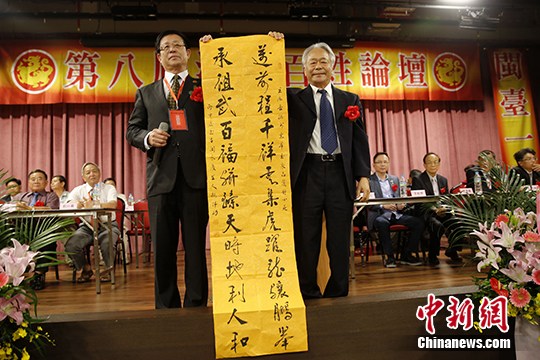 福建省姓氏源流研究会副会长林伟功(左)展示为论坛书写的对联。 中新社记者 陈小愿 摄