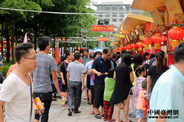 中国台湾网6月11日厦门讯 (记者 何建峰)“来看一看,尝一尝,不好吃不要钱的大肠包小肠!”“原汁原味的莲藕酥,15元一份两份20元!”“现烤现卖好吃的鱿鱼,10元4串!”“正宗道地的台湾美食,不用到台湾也能吃到咯!”……隔着一片林木,记者就能听见各式各样的台湾腔要喝叫卖声了。