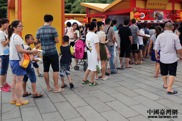 台湾美食摊位前,排起了长长的队伍。(中国台湾网 何建峰 摄)