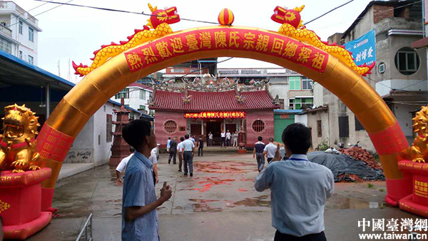 漳州南靖县金山镇霞涌村径尾陈氏宗祠前大陆宗亲搭起了欢迎彩门。(中国台湾网 发)
