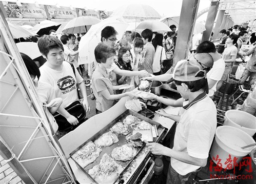 在现场,记者看到,蚵仔煎、深坑臭豆腐、蚵仔面线、大肠包小肠等小吃摊前,早早排起了长队,有市民一下子买了10多个蚵仔煎。参展的小吃业者介绍,这些台湾夜市风味小吃,都是经过层层筛选的,非常正宗。
