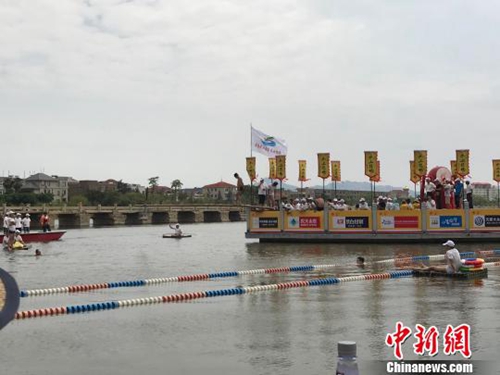 30日,第九届海峡论坛——晋江市(安海)第六届两岸端午民俗旅游文化节拉开帷幕,引来两岸民众共“闹”端午。图为水上捉鸭活动。刘真真摄