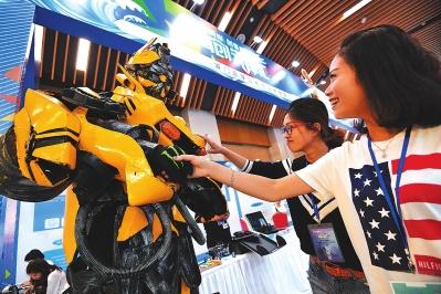 图为“享·双创”两岸文化科技创意展,参展商代表在和机器人互动。(福建日报记者林辉 摄)