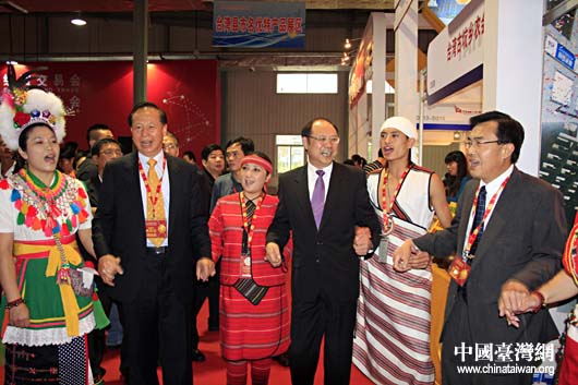 5月18日上午,国台办常务副主任郑立中来到第十一届“海交会”的“台湾县市名优特产品展区”参观,了解参展情况,并和台湾原住民代表手拉手唱起“我们都是一家人”。(中国台湾网 钟宝华 摄)