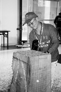 台湾木雕工艺家曾安国在比赛现场进行创作。