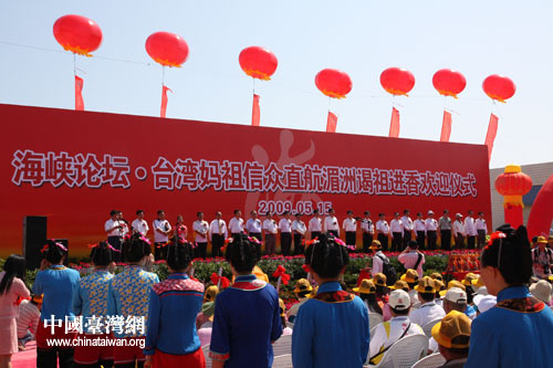 台湾妈祖信众直航湄洲进香团今天下午抵达湄洲码头,图为欢迎仪式现场。(中国台湾网记者 张弛 摄)