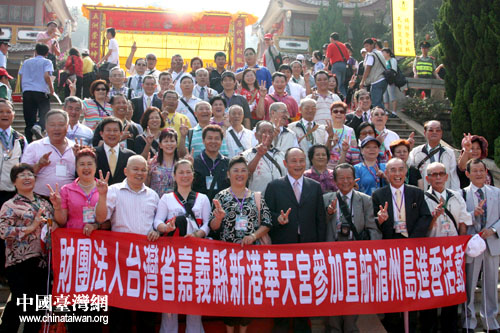 祭祀妈祖祈福大典在湄洲妈祖祖庙广场举行,图为台湾信众合影。(中国台湾网记者 张弛 摄)