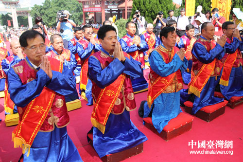 祭祀妈祖祈福大典在湄洲妈祖祖庙广场举行,图为主祭人行三拜九叩之礼。(中国台湾网记者 张弛 摄)