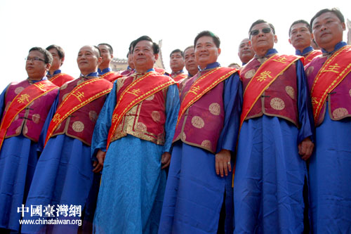 祭祀妈祖祈福大典在湄洲妈祖祖庙广场举行,图为台湾16个妈祖宫庙代表合影。(中国台湾网记者 张弛 摄)