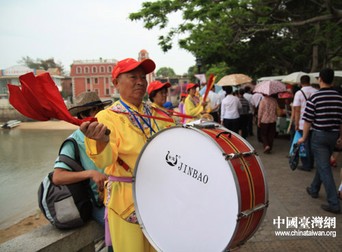 5月17日,来自海峡两岸的民众在厦门思明区鼓浪屿举行盛大颂典,共祭民族英雄郑成功。由此,正式拉开了“郑成功文化节”的大幕。图为“够劲儿”的鼓手大爷。(中国台湾网 邵磌 摄)
